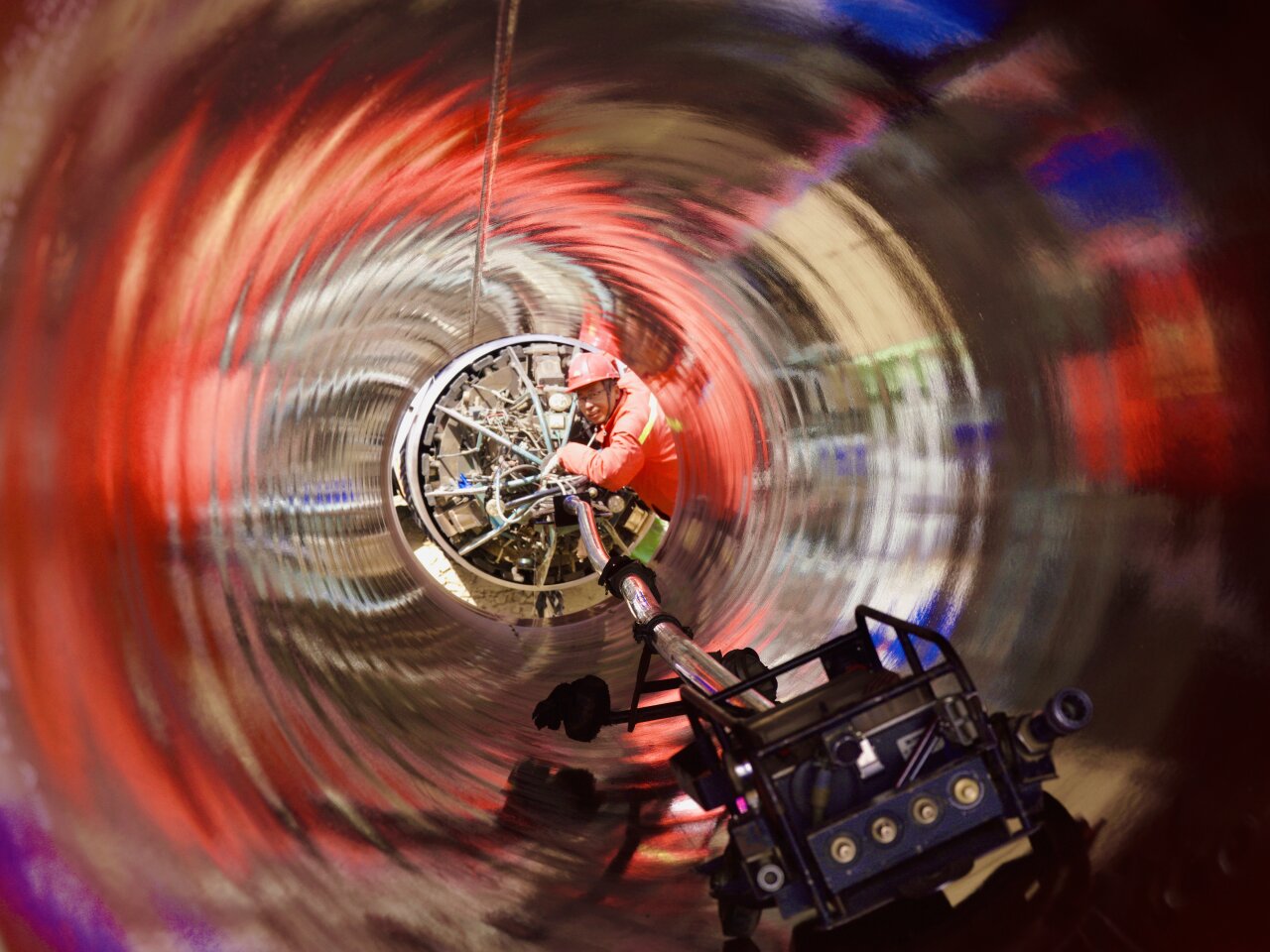工人在中国石油工程建设有限公司中油(新疆)工程油建分公司承建的西气东输四线管道工程二标段进行管线对口作业(2023年4月3日摄)。 崔文娟摄