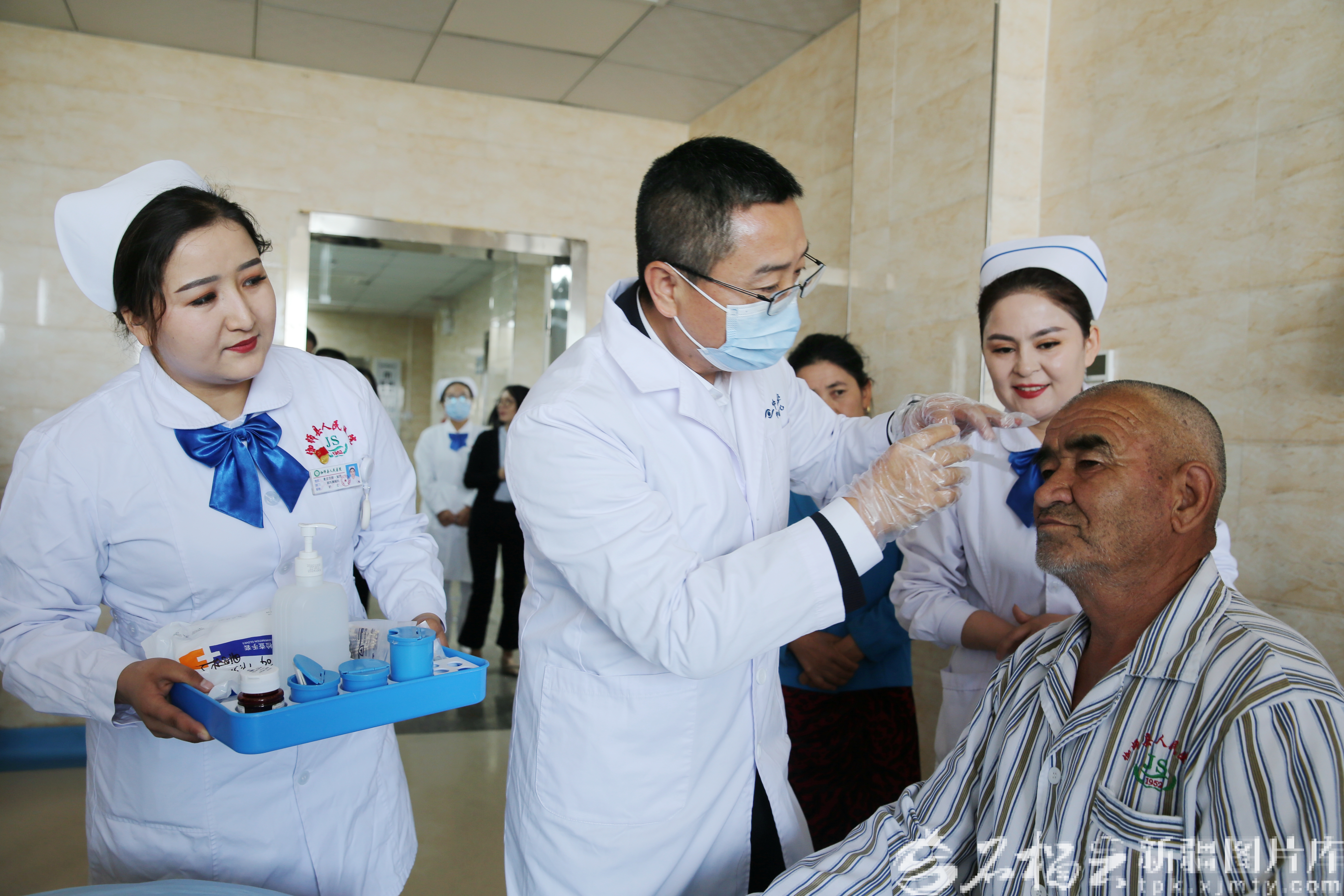 4月25日,中山大学中山眼科中心专家为伽师县做完手术的白内障患者摘取纱布。天山网-新疆日报记者 何新社摄