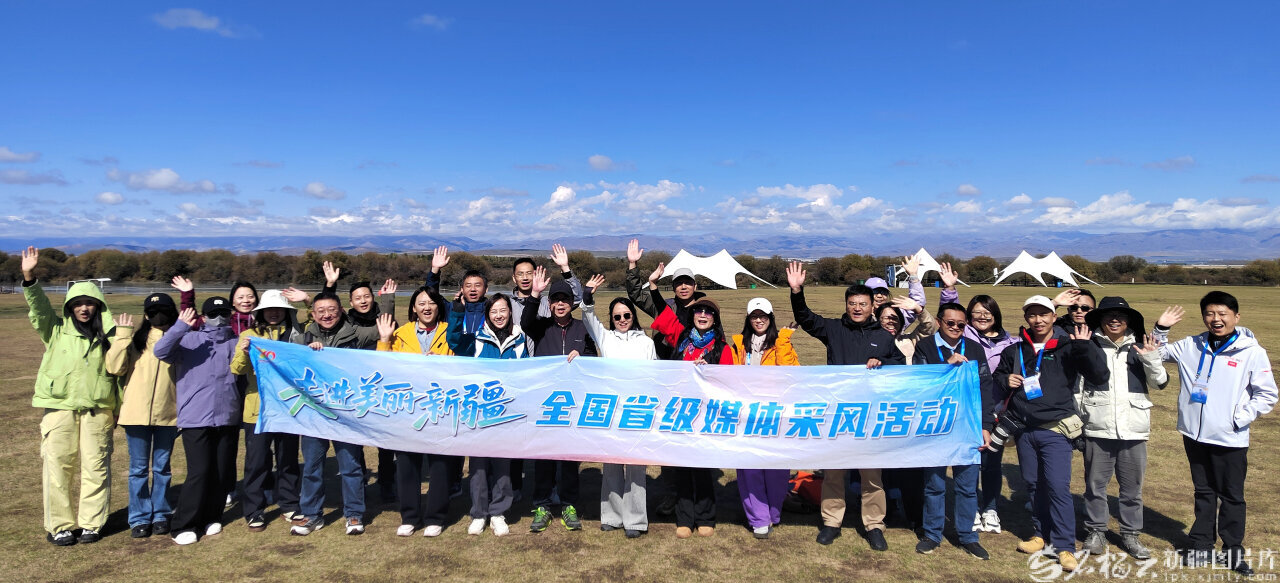 9月20日,采访团一行在昭苏县湿地公园留影。天山网-新疆日报记者 邹懿摄