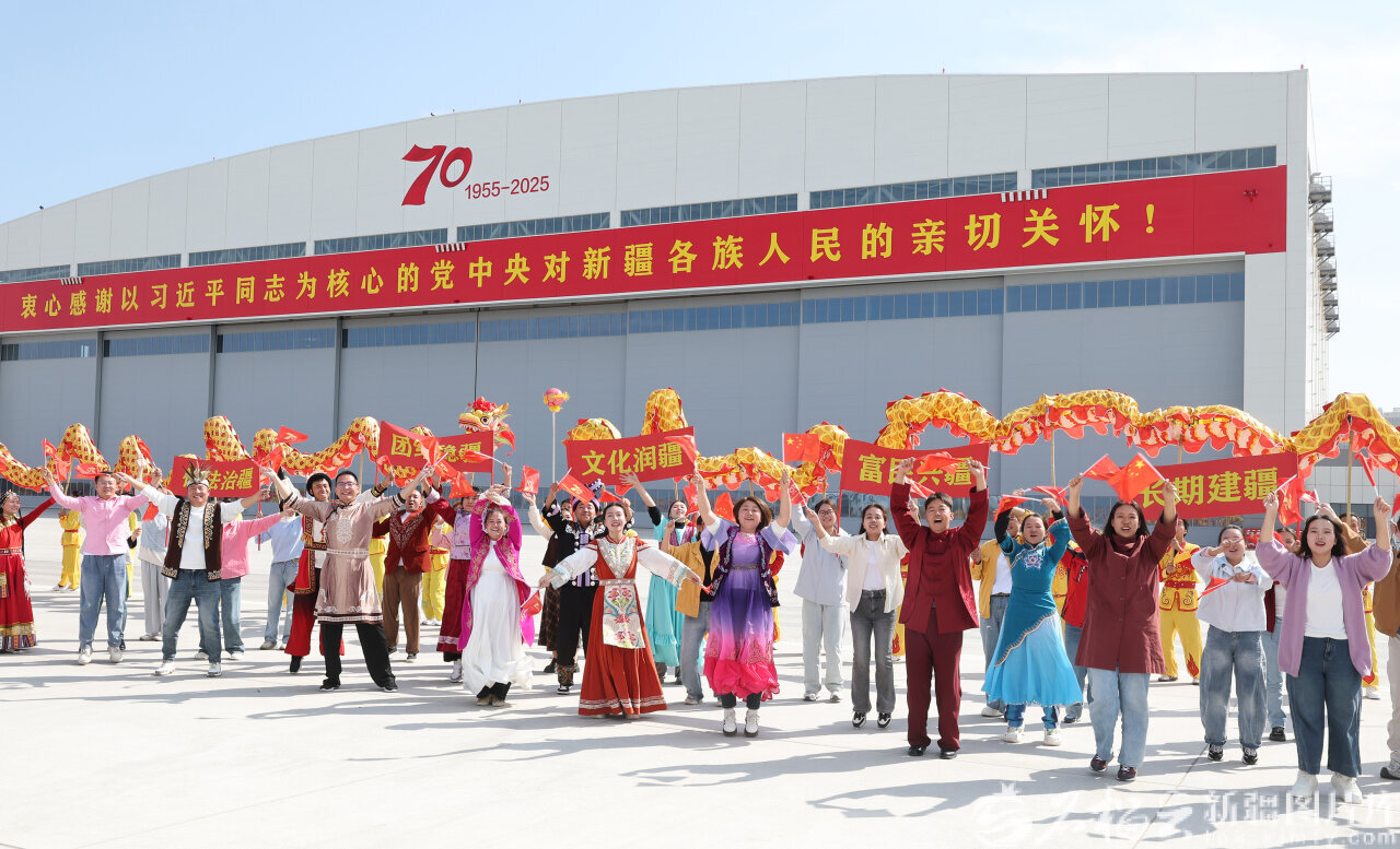 9月23日下午,乌鲁木齐天山国际机场停机坪上,彩龙飞舞、花团摇曳、歌舞欢腾。巨大的“70”字样鲜艳夺目,“衷心感谢以习近平同志为核心的党中央对新疆各族人民的亲切关怀”横幅高高悬挂。新疆各族群众代表身着节日盛装,用最热情的仪式,热烈欢迎来自北京的亲人,欢迎敬爱的习近平总书记。