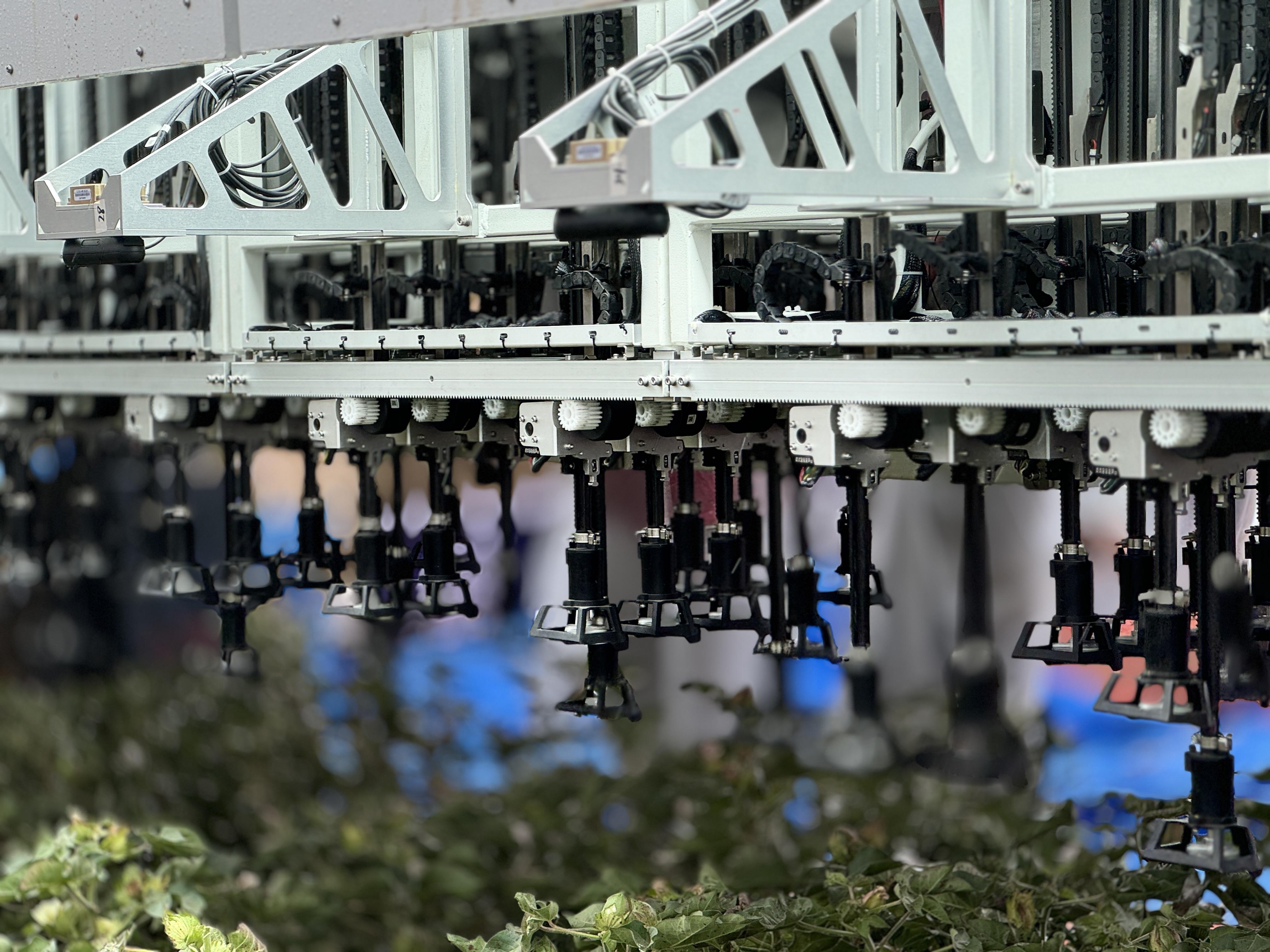 吴帆介绍,新一代棉花打顶机器人融合了多项核心创新,在上一代产品基础上进行了再次升级优化。比如在技术平台方面,采用最新公布的“经纬”平台,其以“灵枢(端侧智能)—天枢(云侧智慧)—地枢(灵活底盘)—星枢(精准农具)”四大模块为核心,让机器人更“聪明”。此外,新一代机器人还进一步加宽车身,抬高底盘,机械臂也由原来的36个增加到108个,单台设备每天可以作业400到600亩,效率可达传统人工打顶的120倍以上。