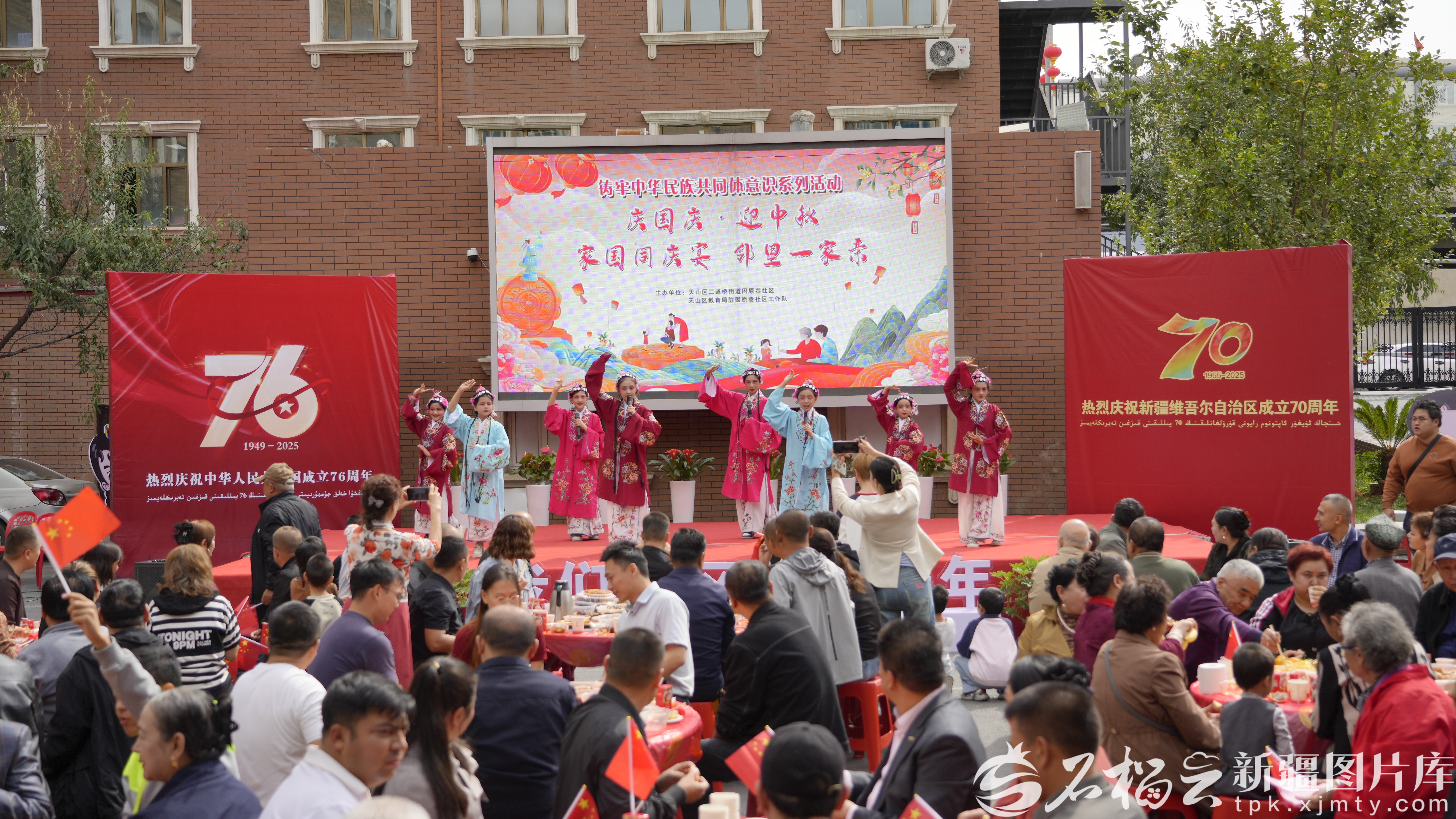 活动现场,“热烈庆祝中华人民共和国成立76周年”“庆祝新疆维吾尔自治区成立70周年”的横幅格外醒目。