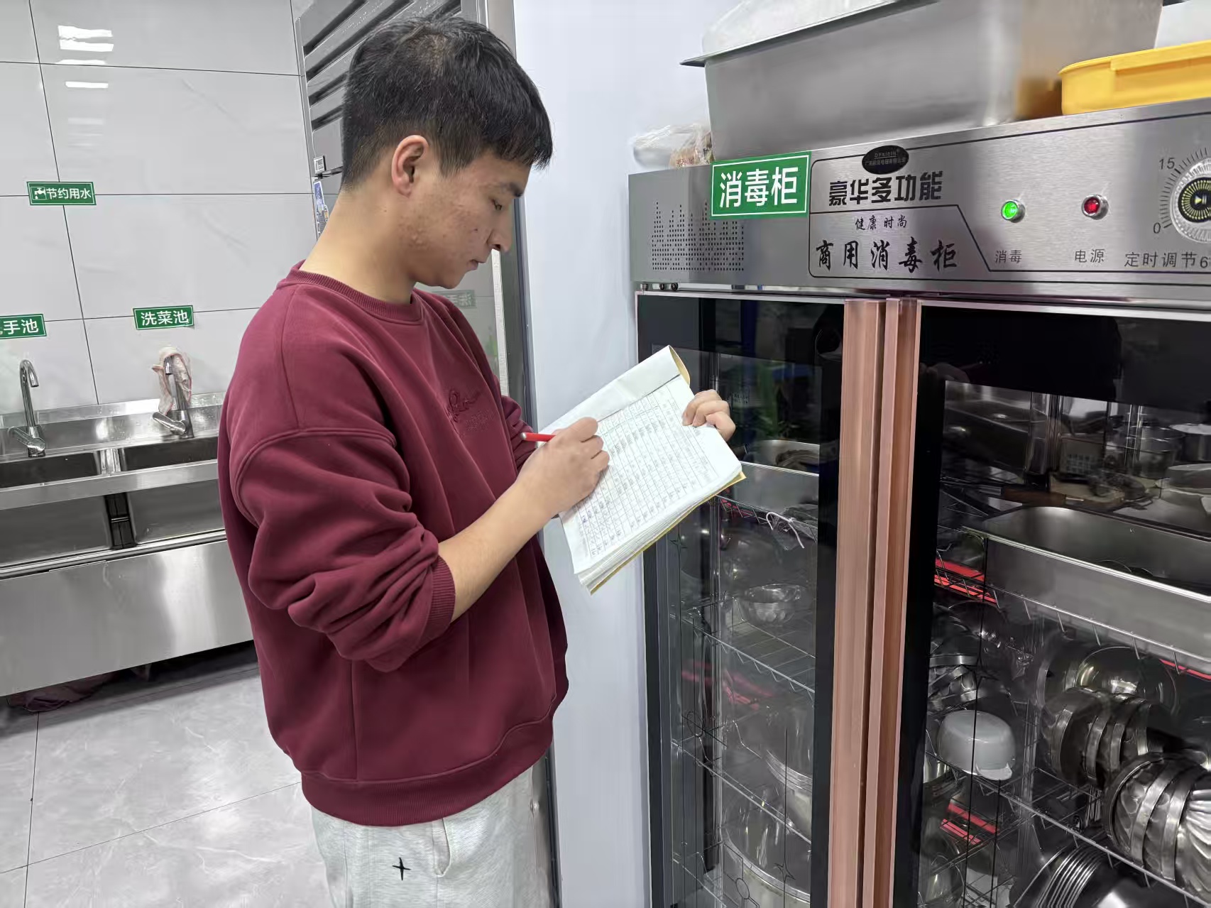 1月6日,伊宁市超维思校外托管中心,高超在检查后厨卫生情况。本人供图